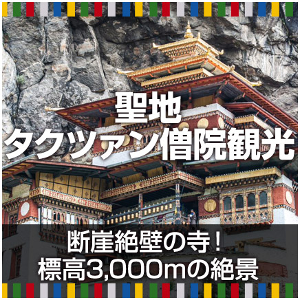 ブータン仏教最大の聖地と言われているのがタクツァン僧院です。標高約3,000mの断崖に建ち、ブータンに仏教を伝えた僧侶が虎に乗って飛来したという伝説があり、別名「虎の巣」とも呼ばれています。標高差500mほどを歩くためゆっくりと高度順応しながら聖地を目指すことをおすすめします。